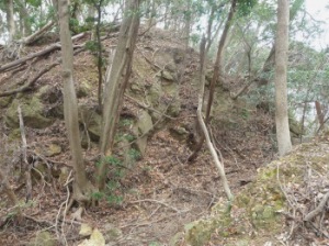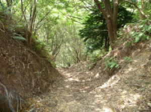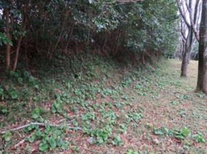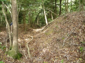 曲輪を取り囲むように掘られた空堀で、斜面を下から登ってくる敵を遮ったり、城兵の通路として利用された。