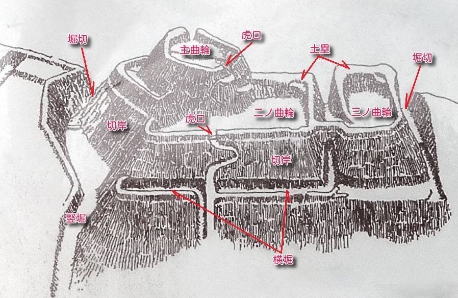 兵の駐屯や建物を築造するため尾根や斜面を造成してつくり出された区画を曲輪といい、当時の文献では「曲輪」の表記が一般的だが、江戸時代には「郭」が用いられた。