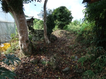 現 状民家脇に祠が祀られている土盛部分が土塁であり、土塁を越えた谷が堀跡である。榊が城は、現在は埋められているが当時は四方を堀で囲まれた要害にある館城であった。 また城跡の南側には、庵跡や上田氏の墓所がある。 |