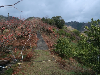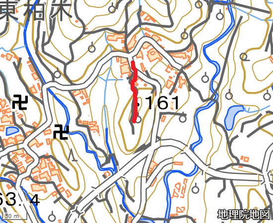 現 状柏木城は通称「城山」と呼ばれる標高159mにある丘城で、南北の尾根上に曲輪が連なった連郭式城郭である。遺構は尾根上に削平された曲輪が3段あり、現在、墓地と柿畑になっている。また、東西側は急斜面で防御性を高めている。 |