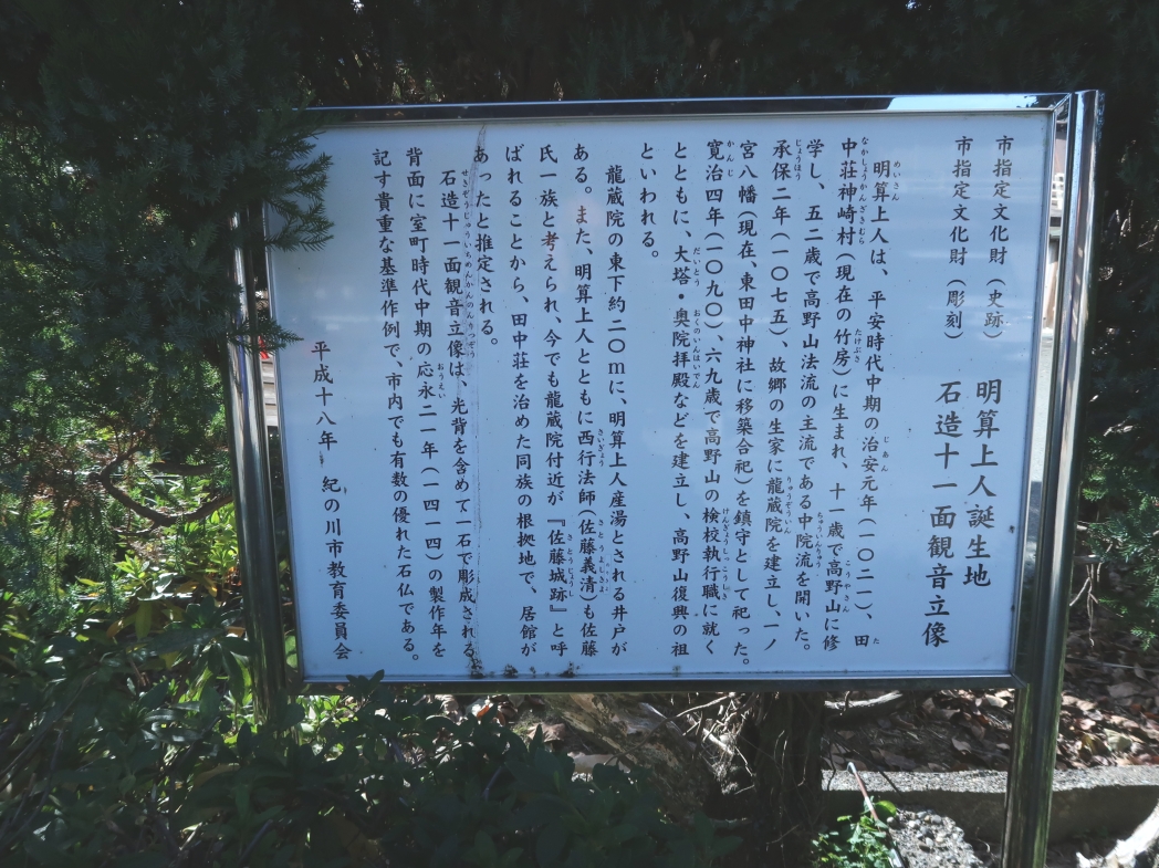 歴 史平安末期である平治元年(1159)に後白河院下文に「田中庄内舎人仲清」が田中荘(旧打田町南部で紀の川より北側)を治めた佐藤仲清であり、龍蔵寺周辺に佐藤城を築いたという。内舎人(うどねり)とは、宮中において天皇の雑役や警護、行幸の際の警護を行う役職で、仲清の弟である義清は、鳥羽院の北面の武士を務め、後に歌人として有名な西行法師である。 高野山中興の祖である明算も佐藤一族の出身である。 |