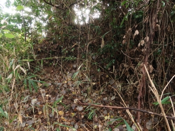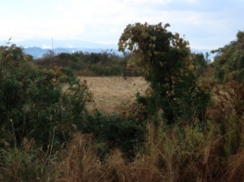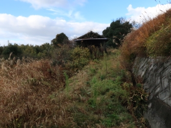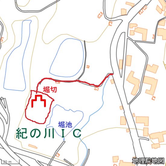 現 状京奈和道紀の川IC北側の河岸段丘先端にある通称「城山」と呼ばれる周辺より一段高い場所に城跡がある。遺構は、現在畑となっている広々した平坦地が曲輪で、曲輪北側の堀切が形を良く残している。堀切には土橋が掛けられ、曲輪入口には土塁の一部が残されているが、この場所が虎口と思われる。 なお、曲輪の東と西側は深い谷となっており切岸により敵を寄せ付けない構造となっている。なお、曲輪東側にある溜池は「堀池」と呼ばれ、南側にかけて当時は堀切があったと推測される。 重行城は小規模な館城であるが、防御性に優れた城である。 |