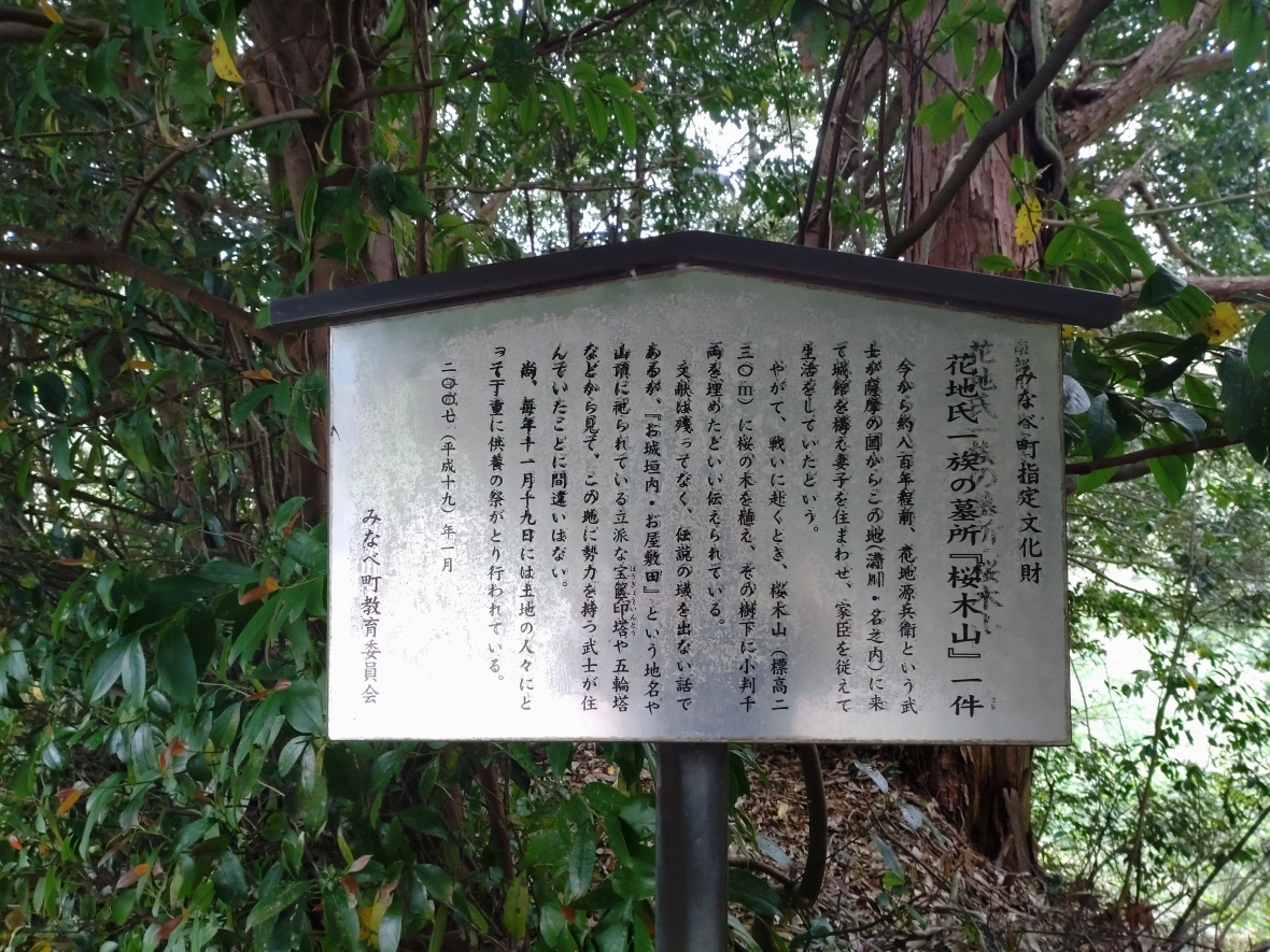 歴 史花地源兵衛は鎌倉時代に薩摩国からこの地に来て城館を構え、妻子を住まわせ家臣を従え生活していた。やがて戦いに赴く時に、この地に戻ることがないことを悟った源兵衛は、桜木山に桜を植えてその樹下に小判を埋めたとの伝承がある。 |