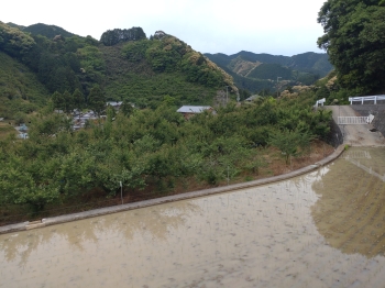 御屋敷田の地名が残る水田と梅畑 | 案内看板 |