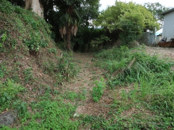 現 状銭坂城は紀ノ川右岸の河岸段丘の先端にある丘城で、城内を大和街道が通過し、関所を設け、通行税を徴収したことから「銭坂」と名付けられたのかもしれない。城跡は、城の内や土居垣内など城跡を示す小字にあり、東西150m、南北100mの範囲であったと推測され、現在は線路や道路、住宅地に改変されている。 遺構は、鈴鹿神社が祀られている土盛り部分の土塁と、土塁外側にL型に折れて横矢掛けの空堀が残されている。 |