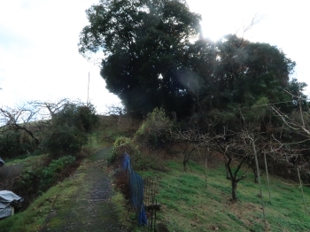 現 状柏木城は通称「城山」と呼ばれる標高159mにある丘城で、南北の尾根上に曲輪が連なった連郭式城郭である。遺構は尾根上に削平された曲輪が3段あり、現在、墓地と柿畑になっている。また、東西側は急斜面で防御性を高めている。 |
