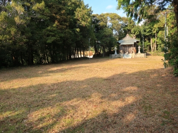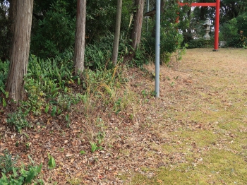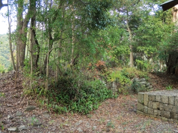 現 状JR江住駅裏にある小高い丘にある春日神社が城跡といわれている。遺構は春日神社境内南側に低い土塁と御社裏側に高さ1mほどの土塁と一部道路工事で改変されているが堀切が1条残されている。 城跡からは江住集落を見下ろせる位置にあり、城館を設けるには適した位置にあることが分かる。 |